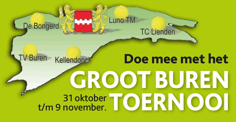 In de eerste week van november (31 oktober t/m 9 november) wordt weer het jaarlijkse Groot Buren Toernooi georganiseerd, het gezamenlijke toernooi van de tennisclubs uit de gemeente Buren. Er wordt gespeeld op De Bongerd, Luno TM, TC Lienden, Kellendonck en TV Buren. Je kunt je tot en met 20 oktober inschrijven voor Herendubbel, Damesdubbel of Gemengd Dubbel in de speelsterkte 5 t/m 8.
